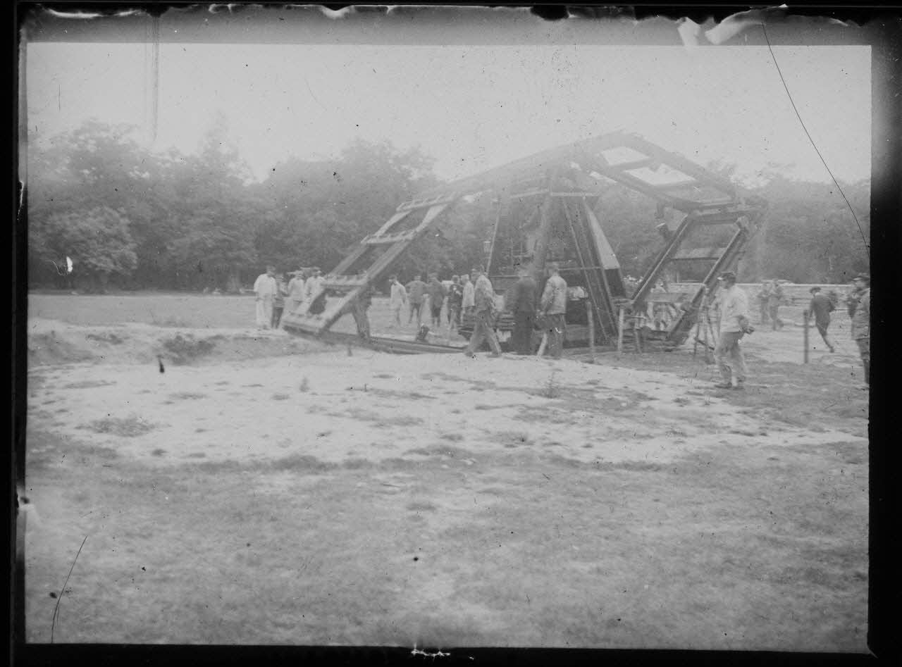 Expérimentation à Maisons-Lafitte de l'engin dit "appareil Boirault", prototype visant à favoriser le franchissement des tranchées à l'aide du système de chenilles imposant et capable d'écraser les barbelés.