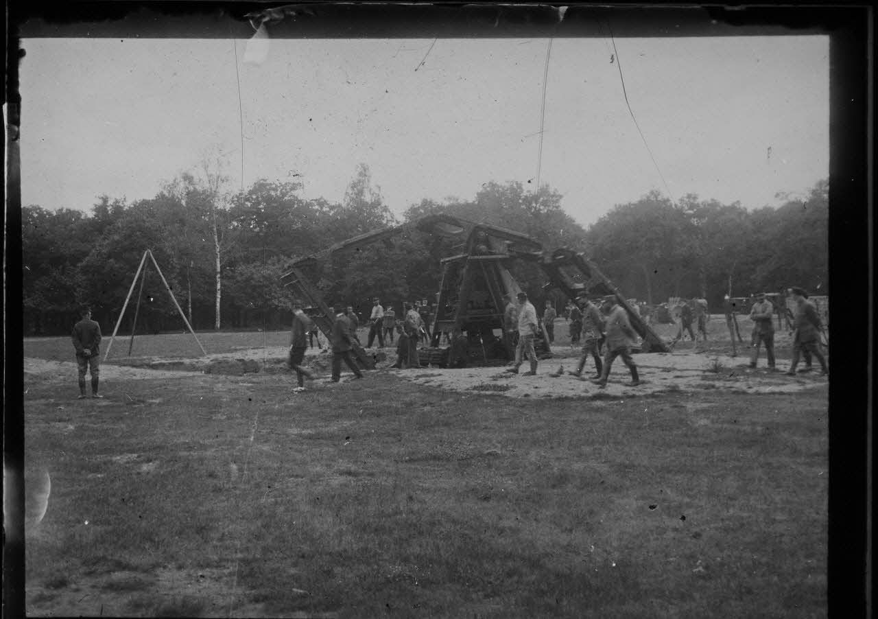 Expérimentation à Maisons-Lafitte de l'engin dit "appareil Boirault", prototype visant à favoriser le franchissement des tranchées à l'aide du système de chenilles imposant et capable d'écraser les barbelés.