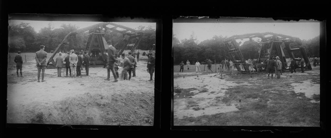 Expérimentation à Maisons-Lafitte de l'engin dit "appareil Boirault", prototype visant à favoriser le franchissement des tranchées à l'aide du système de chenilles imposant et capable d'écraser les barbelés.