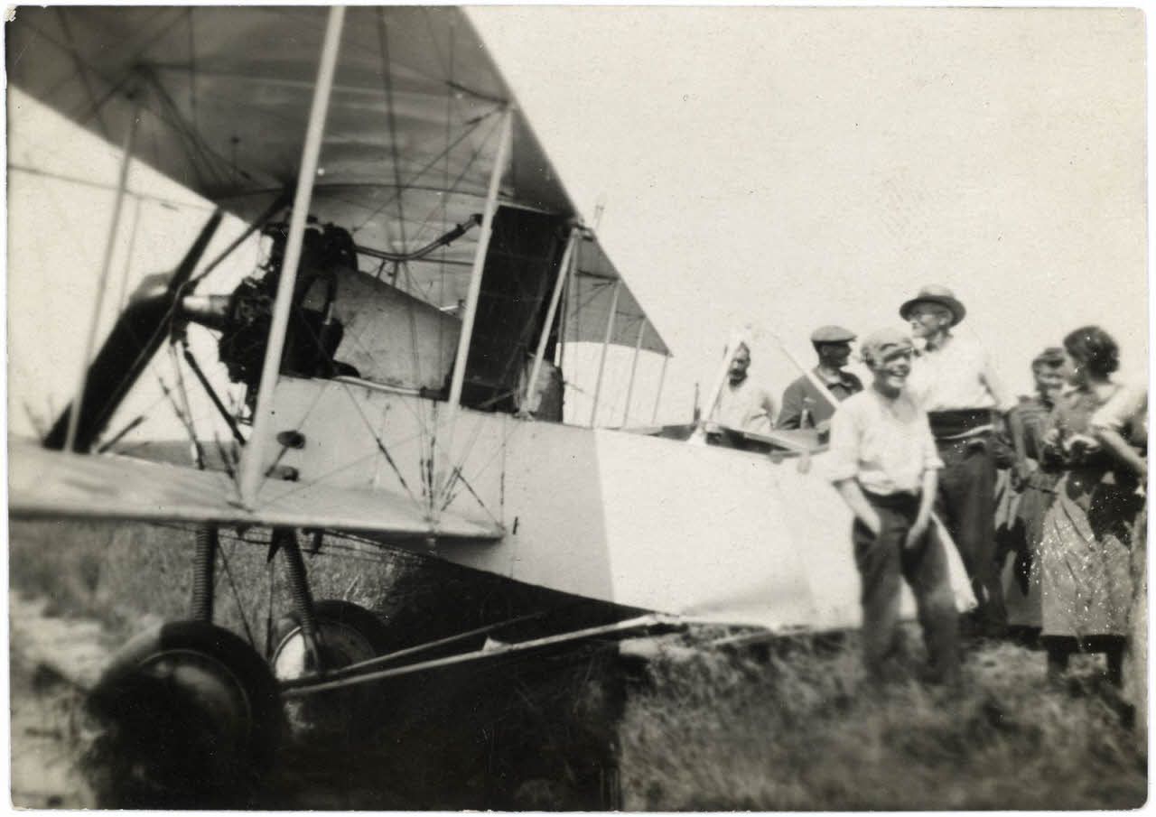 D169-9-16. [Luc Pupat et pilotes devant un avion sur le terrain de Catigny].