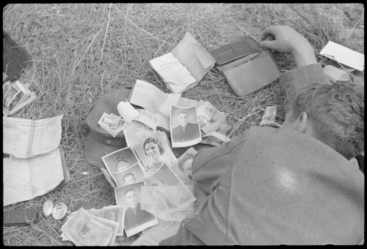 Après avoir échappé à la retraite de Vilnius, un fantassin allemand fait sécher le contenu de ses poches, ici, des billets de banque.