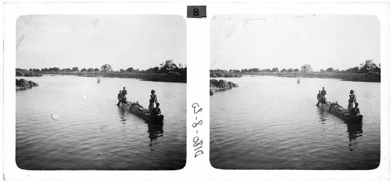Après rapide de Kendadji, arrivée de mes pirogues. [légende d'origine]
