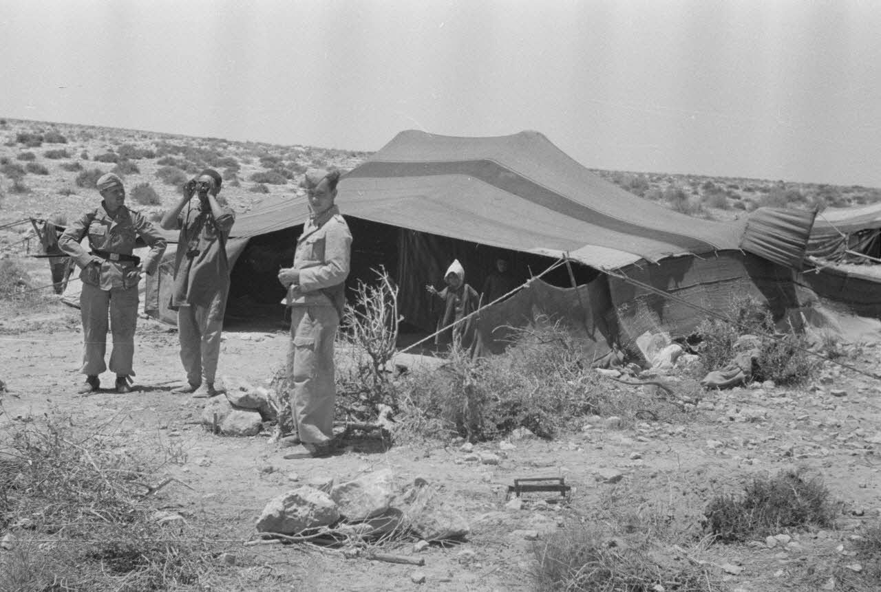 En Libye, sous une tente, deux aviateurs partagent un repas avec des bédouins.