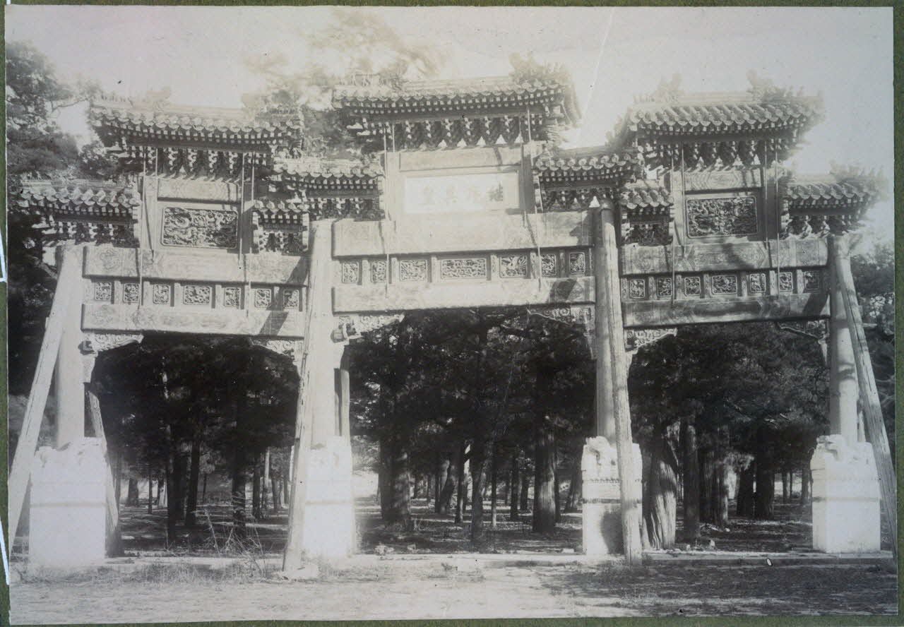 Arc de triomphe en bois, couverture en tuiles vernissées jaunes, dans le jardin de la Montagne de Charbon. [légende d'origine]