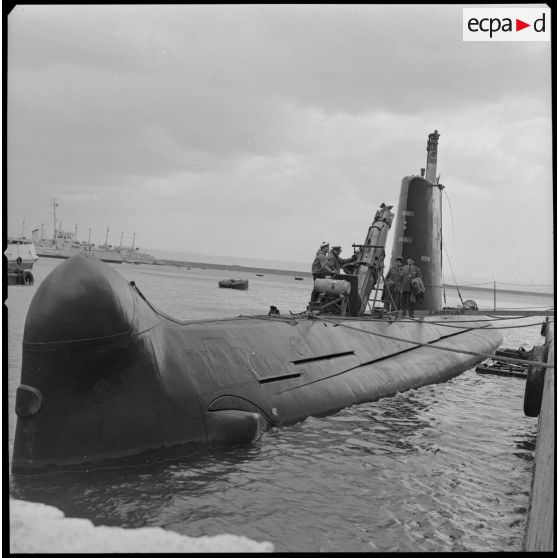 La tournée des aumôniers se poursuit dans la base de Mers-el Kébir avec quelques vues du sous-marin Amazone. L'aumônier du 2e régiment de zouaves (2e RZ) pose avec des marins sur sa coque et dans sa baignoire.