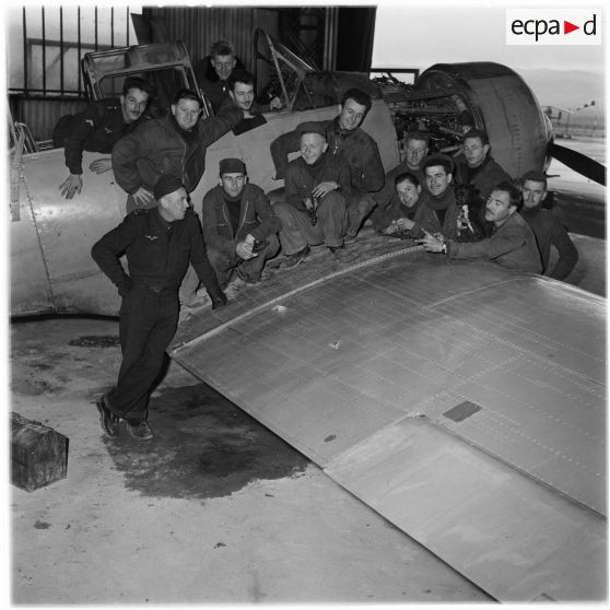 Mécaniciens et officiers de l'armée de l'Air autour d'un avion dans un hangar.