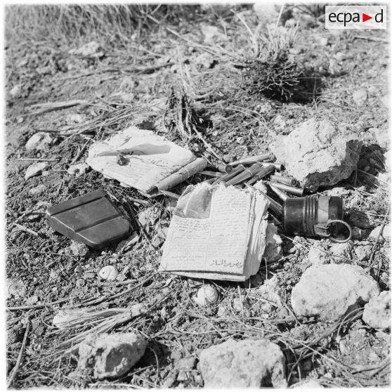 Les papiers et munitions d'un rebelle dans le djebel Tarf.