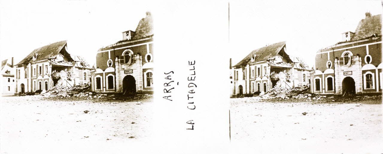 Ce reportage rassemble des photographies de la ville détruite d'Arras : la porte Beaudimont, la cathédrale, l'hôtel de ville, la citadelle, et divers quartiers.