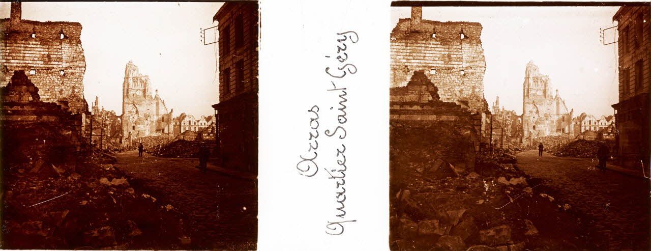 Ce reportage rassemble des photographies de la ville détruite d'Arras : la porte Beaudimont, la cathédrale, l'hôtel de ville, la citadelle, et divers quartiers.