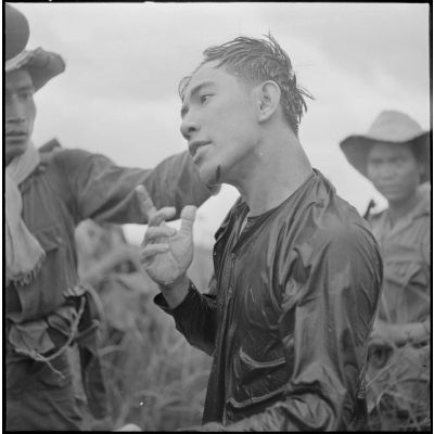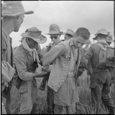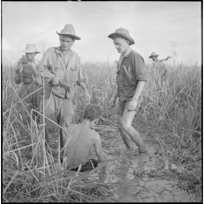 Arrestation dans une rizière d'un légionnaire européen rallié au Vietminh, par des éléments du 43e régiment d'infanterie coloniale au cours de l'opération Tourbillon 2 en plaine des Joncs.