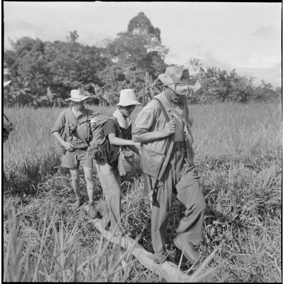 Progression d'une colonne de fantassin du 43e régiment d’infanterie colonial à travers les marécages au cours de l’opération Tourbillon 2.