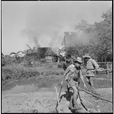 Paillotes Vietminh incendiées au cours de la progression des troupes lors de l'opération Tourbillon 2.