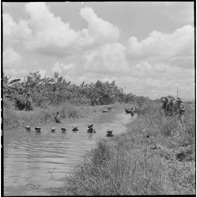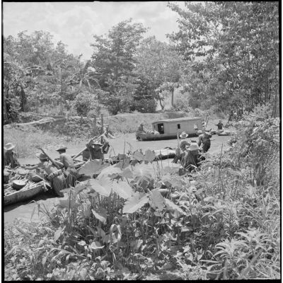 Des tirailleurs du 43e régiment d’infanterie colonial (43e RIC) fouillant un rach courent vers les sampans pour prendre leurs armes alors que le Vietminh vient d'ouvrir le feu, lors de l’opération Tourbillon 2.