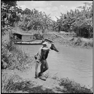 Un sergent du 43e régiment d’infanterie colonial (43e RIC) rapporte des grenades Viêt-minh récupérées lors de la fouille du rach.
