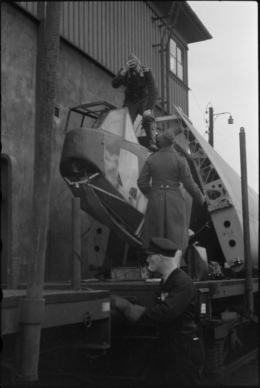Des cheminots norvégiens et des personnels du 8./Luftlande-geschwader 1 (8./LLG1) examinent les planeurs DFS-230 chargés sur des wagons lors du déplacement vers un nouveau terrain d'aviation.