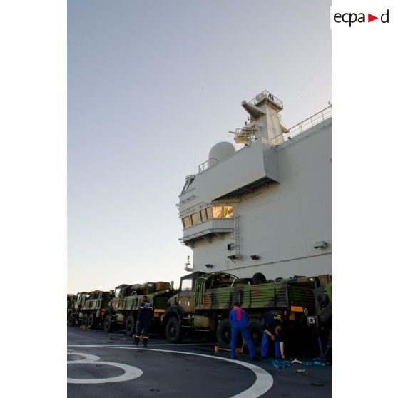 Préparation au débarquement des camions GBC-180 KT depuis le pont d'envol du bâtiment de projection et de commandement Dixmude (L9015).