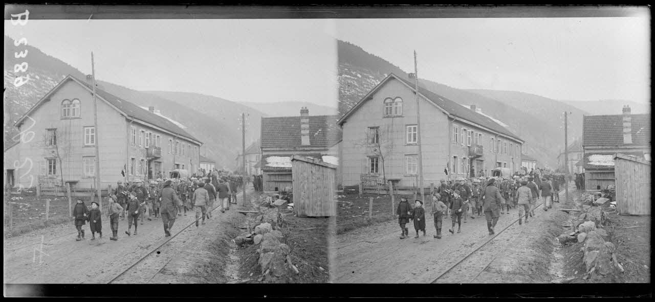 Arrivée d’un régiment dans un village des Vosges. [légende d’origine]