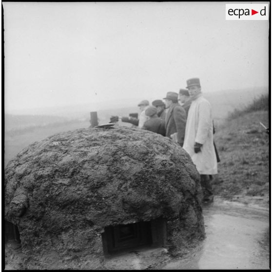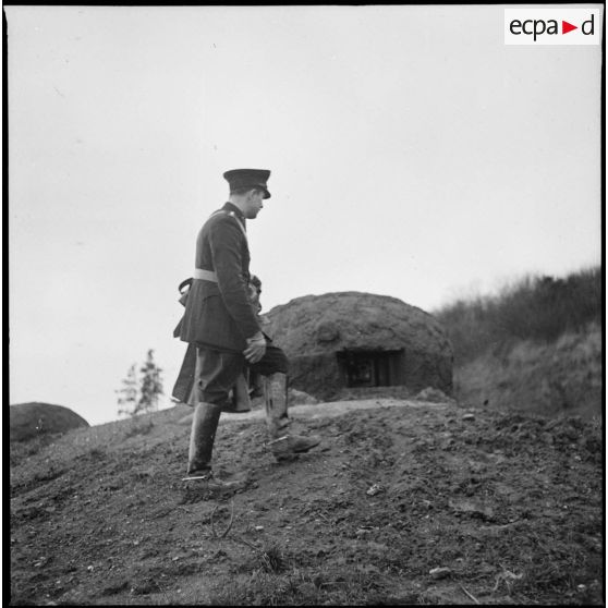 Une personnalité en visite au Mont des Welches, ouvrage fortifié de la ligne Maginot est photographiée en pied.