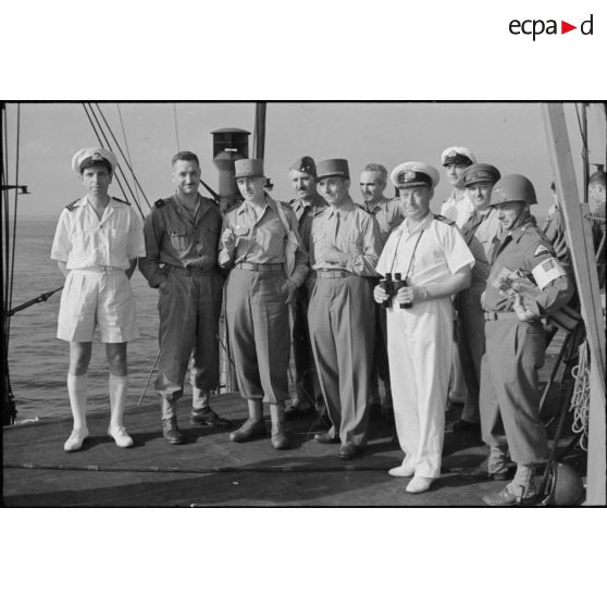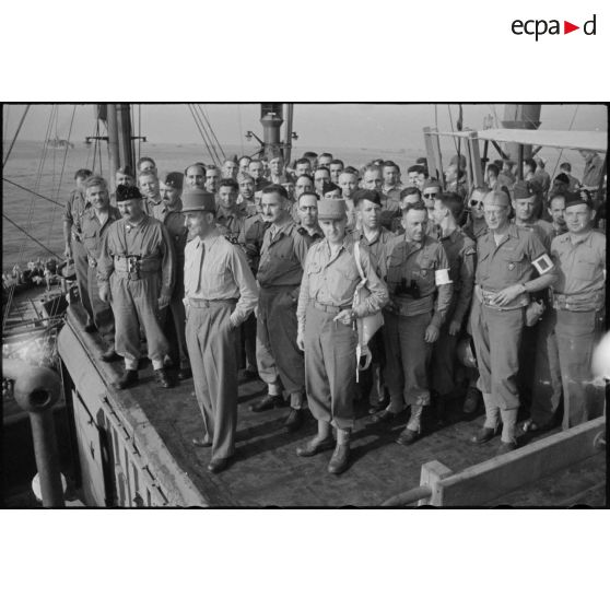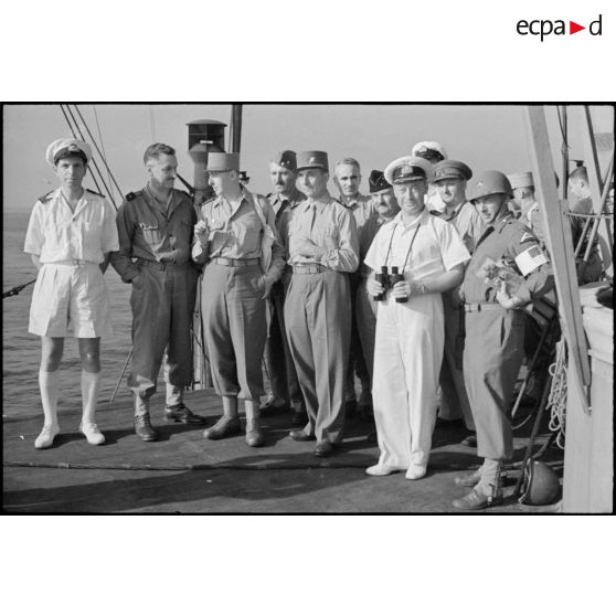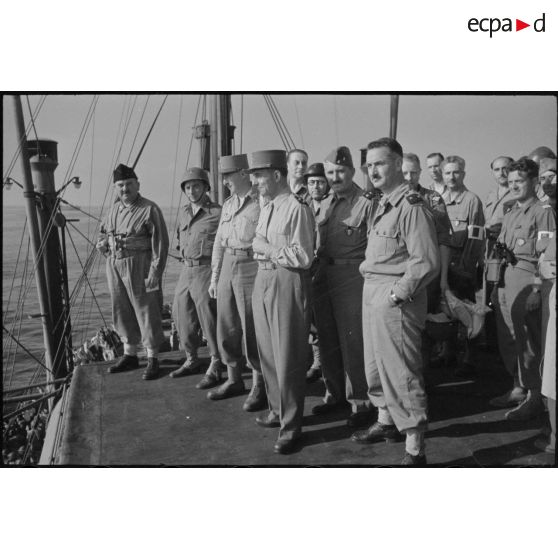 Le général de Lattre de Tassigny, commandant l'Armée B, le général de Larminat, son adjoint et le général Carpentier, commandant la 2e DIM (Division d'Infanterie Marocaine) sur le pont du paquebot M.S. Batory, s'apprêtent à débarquer.
