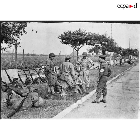Etat-major et tirailleurs du 7e régiment de tirailleurs algériens (7e RTA) après leur débarquement.