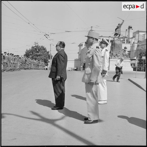 Monsieur Lacoste, le général Noiret et monsieur Maurice Papon saluant les troupes.