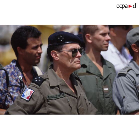 Le général de corps d'armée Michel Roquejeoffre, commandant en chef de l'opération Daguet, entouré de journalistes, attend l'arrivée du ferry affrété Corse.