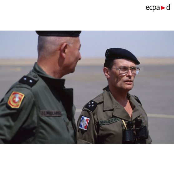 Le général de brigade Jean-Charles Mouscardès, commandant les éléments Terre du dispositif Daguet, et le général de corps d'armée Michel Roquejeoffre, commandant en chef de l'opération Daguet.