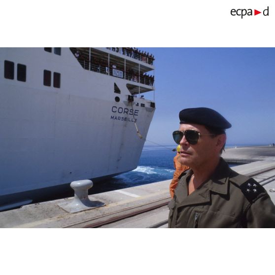 Le général de corps d'armée Michel Roquejeoffre, commandant en chef de l'opération Daguet, à l'arrivée du ferry affrété Corse à Yanbu.