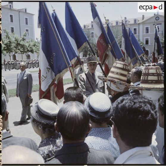 Le général de Gaulle salue les anciens combattants lors de sa venue à Sidi-bel-Abbès.