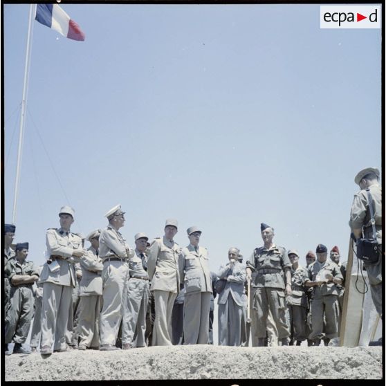 Cérémonie militaire à Sidi-bel-Abbès devant le monument de la légion lors de la venue du général de Gaulle.