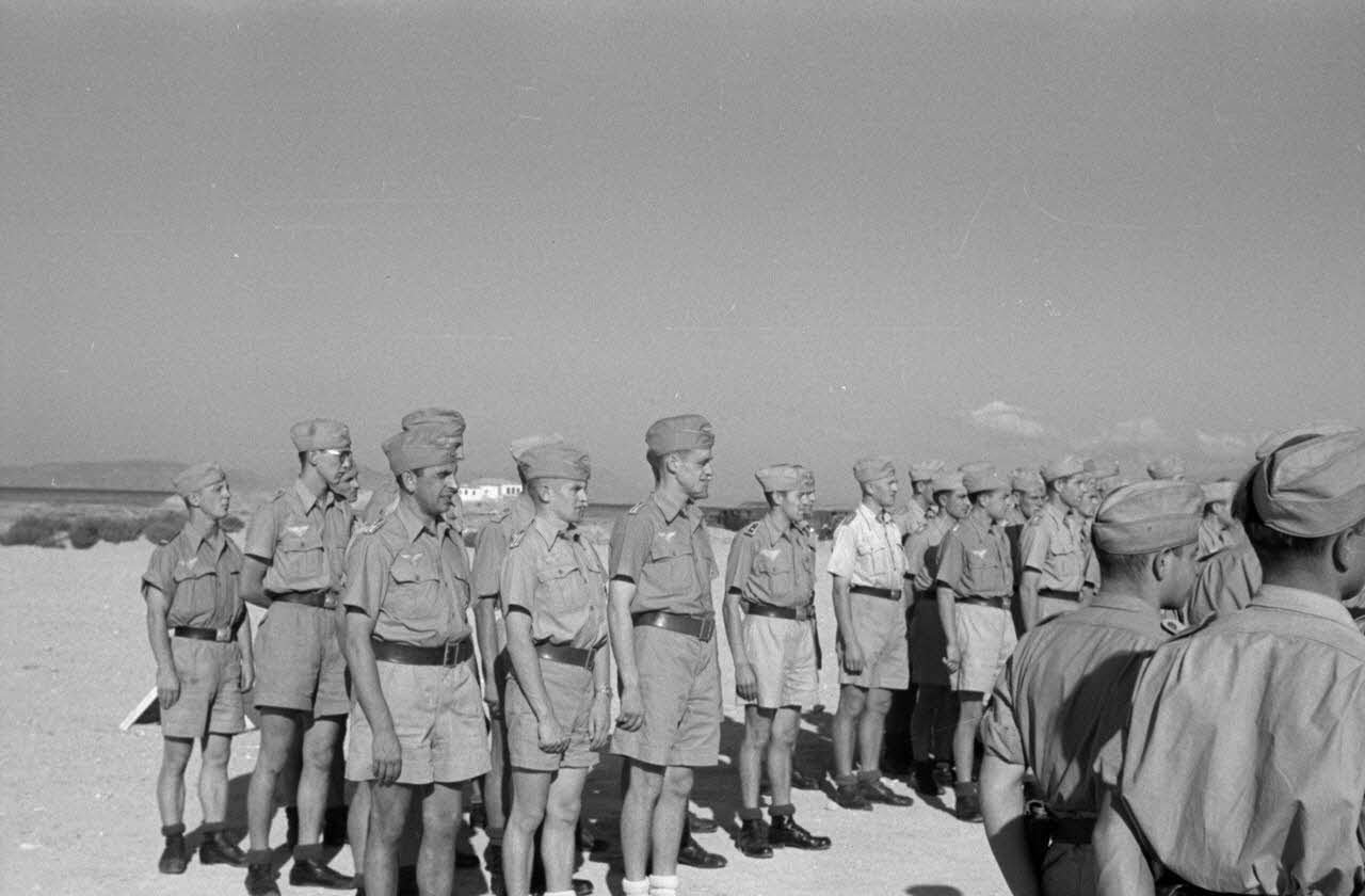 Note : Consulter les légendes du reportages conservées au Bundesarchiv de Freiburg RL 15-83C-245 (Luftwaffe KbK.7 film 1771). Consulter le reportage DAA 2500 pour retrouver la même revue du général Hoffmann von Waldau. Le reportage DAA 2500 est daté d'août 1942 mais situé par un lecteur en Cyrénaique.