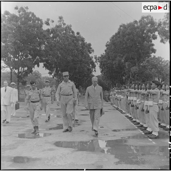 A son arrivée à Hanoï, M. Gautier passe les troupes en revue, en compagnie du génél Cogny.