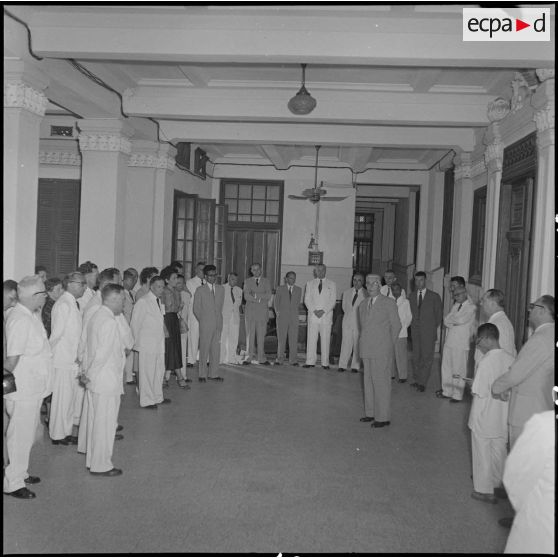 M. Gautier, haut-commissaire de France au Vietnam, fait un discours devant les fonctionnaires de la Délégation du Haut-Commissariat de France.