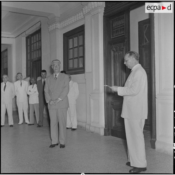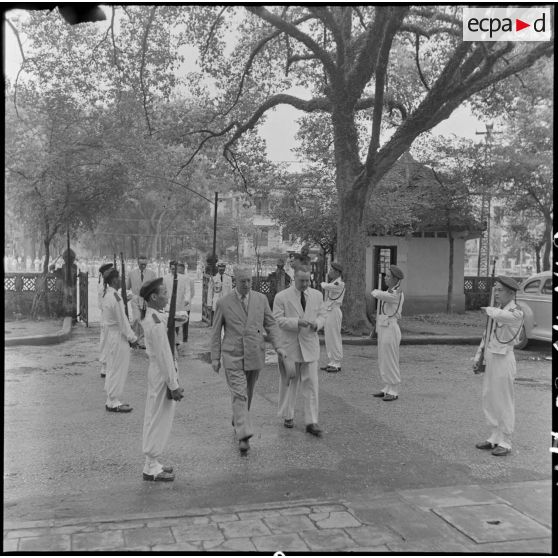 Après avoir passé les troupes en revue avec le général Cogny, M. Gautier, haut-commissaire de France au Vietnam, en visite dans le Nord-Vietnam, se rend à la délégation du Haut-commissariat de France à Hanoï en compagnie de M. Merlo, délégué général du haut-commissaire de France au Nord-Vietnam. Il y rencontre les fonctionnaires qui y travaillent.