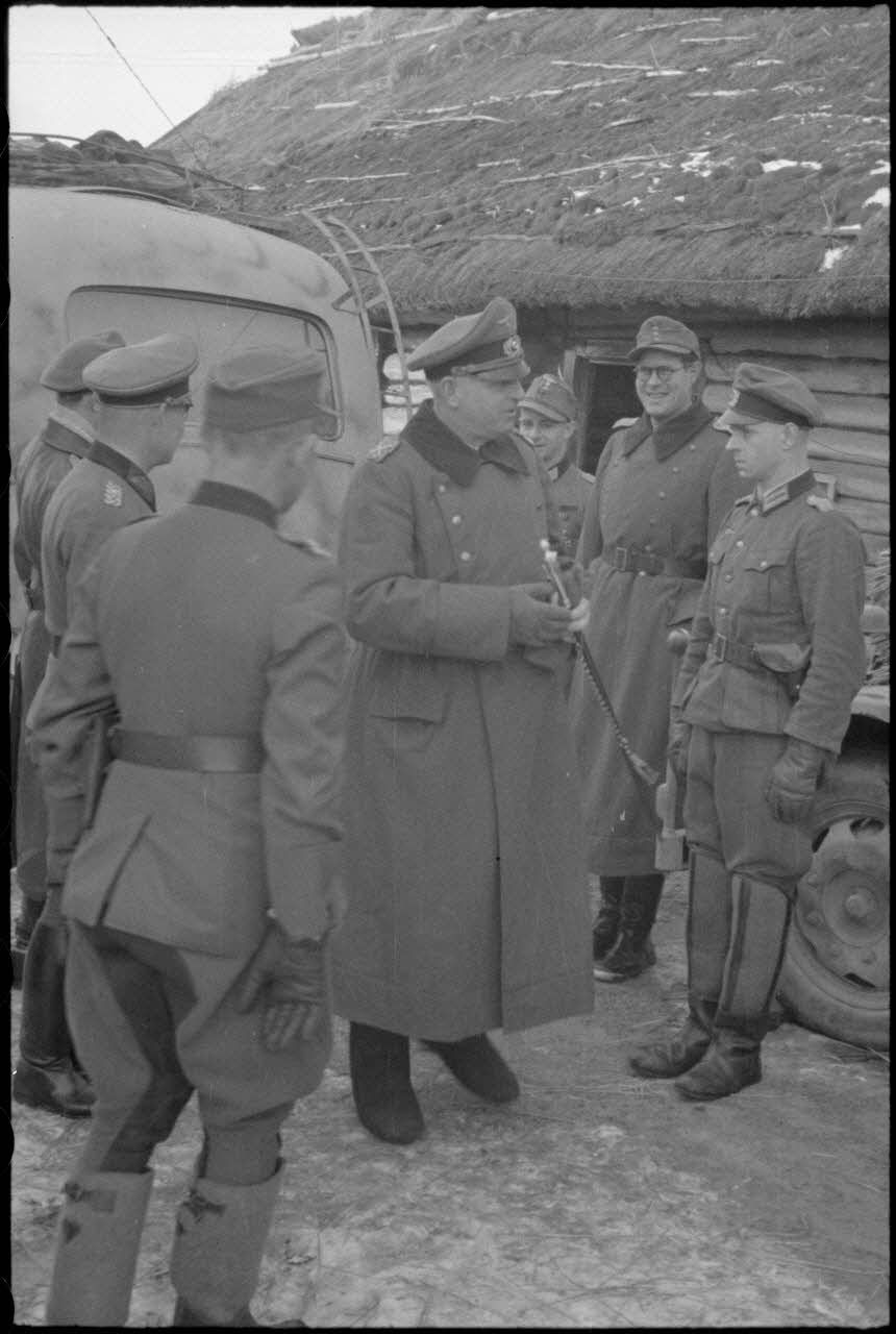 Arrivée du maréchal (Generalfeldmarschall) Ernst Busch, nouveau commandant du Groupe d'armées Centre pour une réunion avec le général (Generalleutnant) Helmut Thumm (Kdr. de la 5. Jäger. Division).