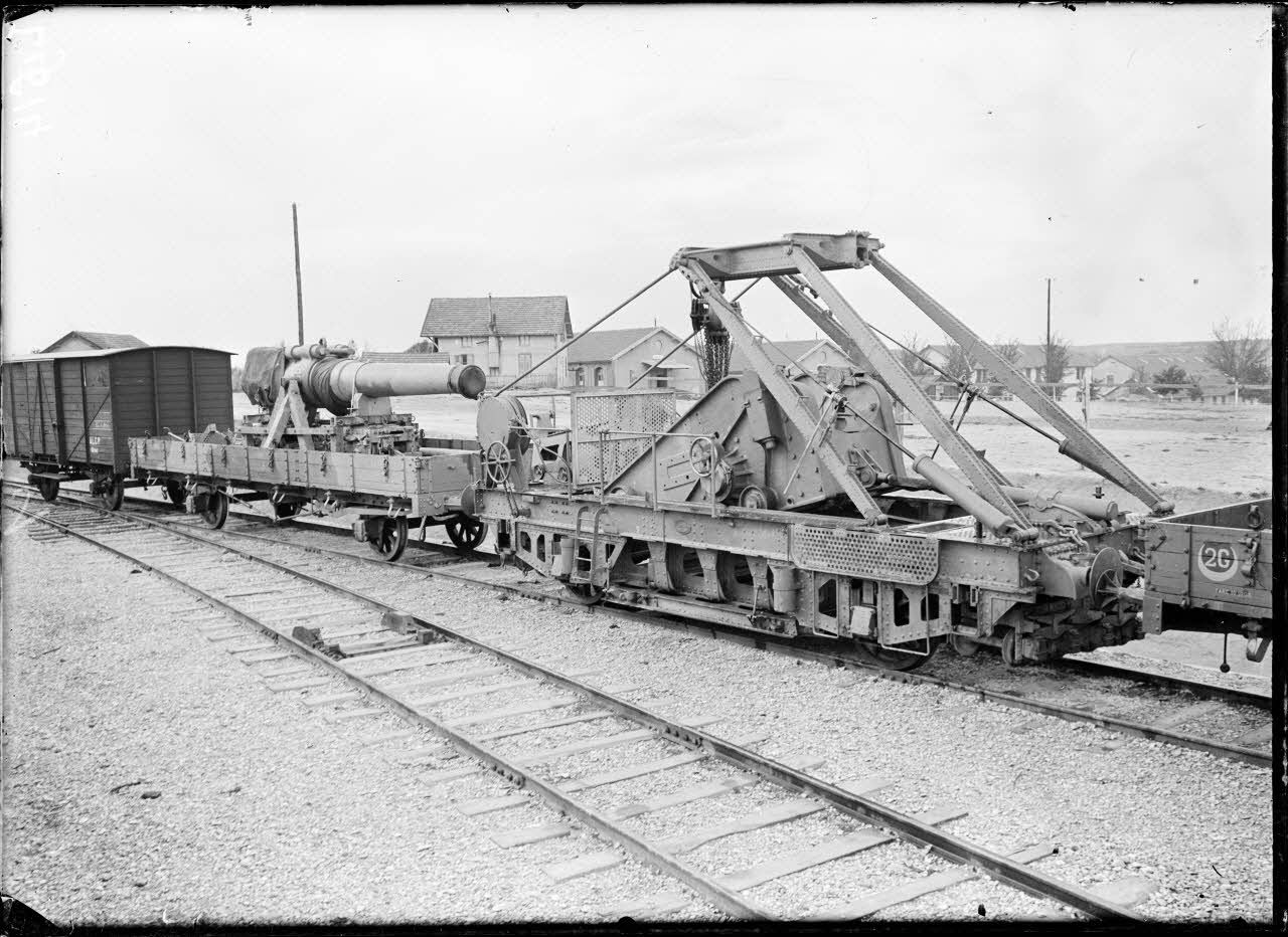 Arsenal de Mailly. Le canon de 240 mm TR est porté par des wagonnets qu'il va abandonner pour être transporté par une grue sur son affût.