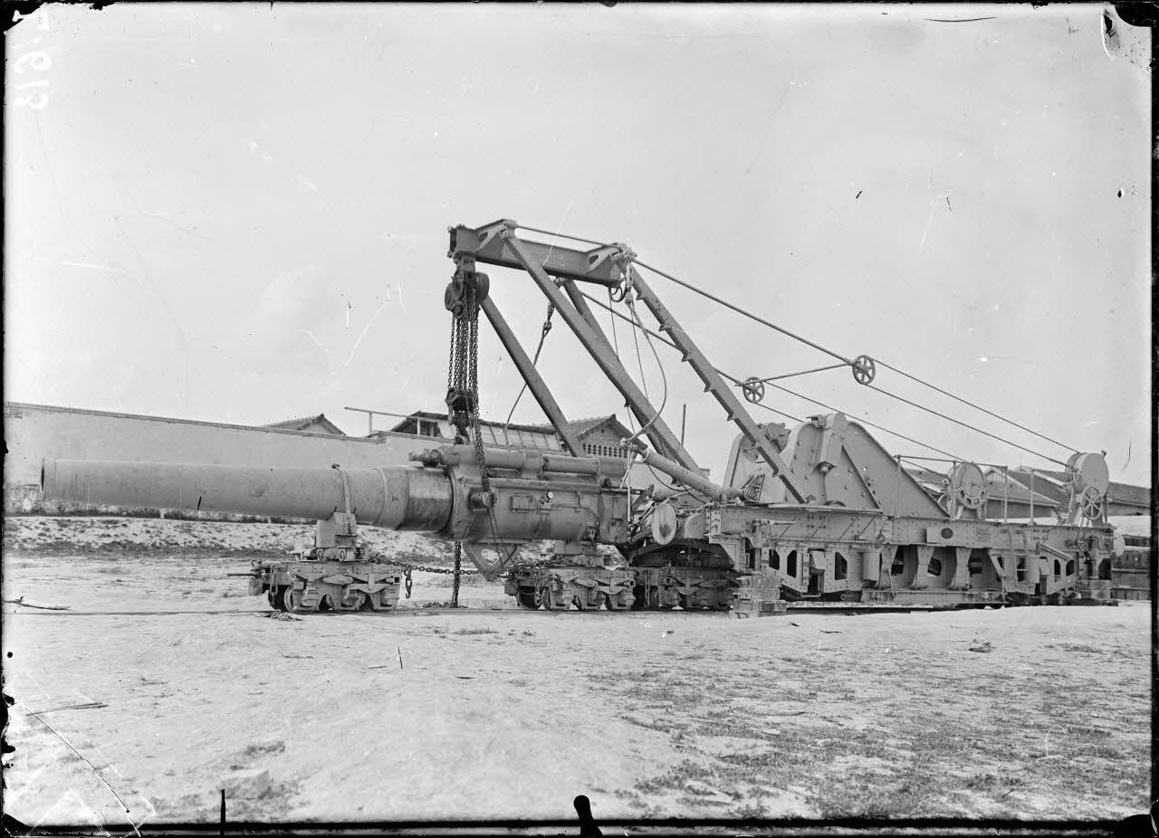 Arsenal de Mailly. Le canon de 240 mm TR est porté par des wagonnets qu'il va abandonner pour être transporté par une grue sur son affût. [légende d'origine]