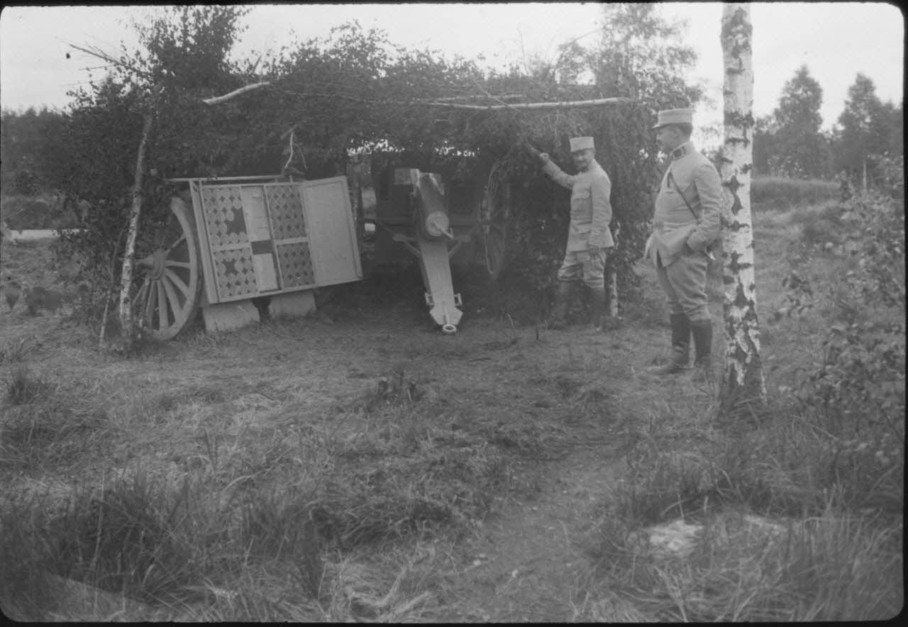 Deux officiers posant devant un canon d'artillerie de 75 mm et son caisson camouflés derrière des branchages.