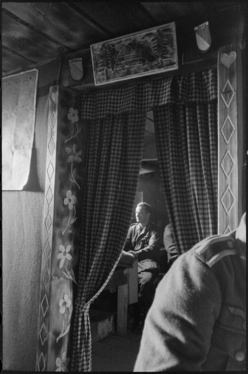Un fantassin sculpte un bâton de marche (PK697 F772 L11 et L12). Des fantassins autour d'une table vont partager un verre d'une bouteille de Underberg (Semper idem) aux plantes aromatiques ( PK697 F772 L13 à L15). Aspects des lits réservés aux soldats, un poêle à bois les préserve du froid. Le sommier est rudimentaire et le plafond loge les fusils Mauser 98 k et les casques. Chaque recoin est utilisé pour ranger des objets, ici le plancher reçoit également des provisions aromatiques (PK697 F772 L23 à L24). Au mur, des étagères accueillent des livres et de la vaisselle. Plus loin, une pièce est réservée à un officier ( PK697 F772 L26 à L27). L'entrée de l'abri baptisé "Bunker der schweren Jungs" (abri des jeunes costauds) ( PK697 F772 L28). Un râtelier accueille l'équipement individuel des fantassins, composé de fusils Mauser 98k, de casques et de masques à gaz ( PK697 F772 L29). Au mur, une étagère accueille le courrier et de la lecture, ici le magazine "Die Woche" ( PK697 F772 L30). Un portrait d'Adolf Hitler et une horloge (coucou) se partagent le reste du mur ( PK697 F772 L31 et L32).
