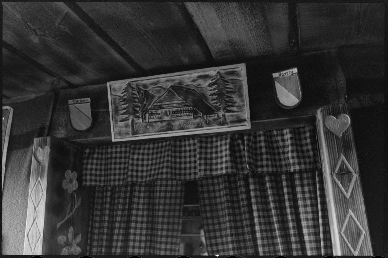 Sur le fronton des portes intérieures ornées de fleurs et de motifs montagneux, on note accrochés sur les murs, le blason de la Bavière, les armoiries de Baden ainsi qu'une maison typique de la Forêt-Noire.