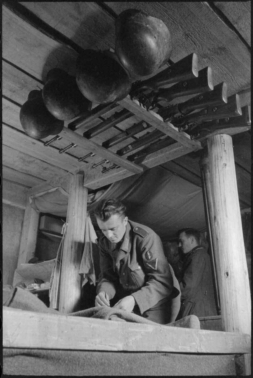 Un fantassin sculpte un bâton de marche (PK697 F772 L11 et L12). Des fantassins autour d'une table vont partager un verre d'une bouteille de Underberg (Semper idem) aux plantes aromatiques ( PK697 F772 L13 à L15). Aspects des lits réservés aux soldats, un poêle à bois les préserve du froid. Le sommier est rudimentaire et le plafond loge les fusils Mauser 98 k et les casques. Chaque recoin est utilisé pour ranger des objets, ici le plancher reçoit également des provisions aromatiques (PK697 F772 L23 à L24). Au mur, des étagères accueillent des livres et de la vaisselle. Plus loin, une pièce est réservée à un officier ( PK697 F772 L26 à L27). L'entrée de l'abri baptisé "Bunker der schweren Jungs" (abri des jeunes costauds) ( PK697 F772 L28). Un râtelier accueille l'équipement individuel des fantassins, composé de fusils Mauser 98k, de casques et de masques à gaz ( PK697 F772 L29). Au mur, une étagère accueille le courrier et de la lecture, ici le magazine "Die Woche" ( PK697 F772 L30). Un portrait d'Adolf Hitler et une horloge (coucou) se partagent le reste du mur ( PK697 F772 L31 et L32).