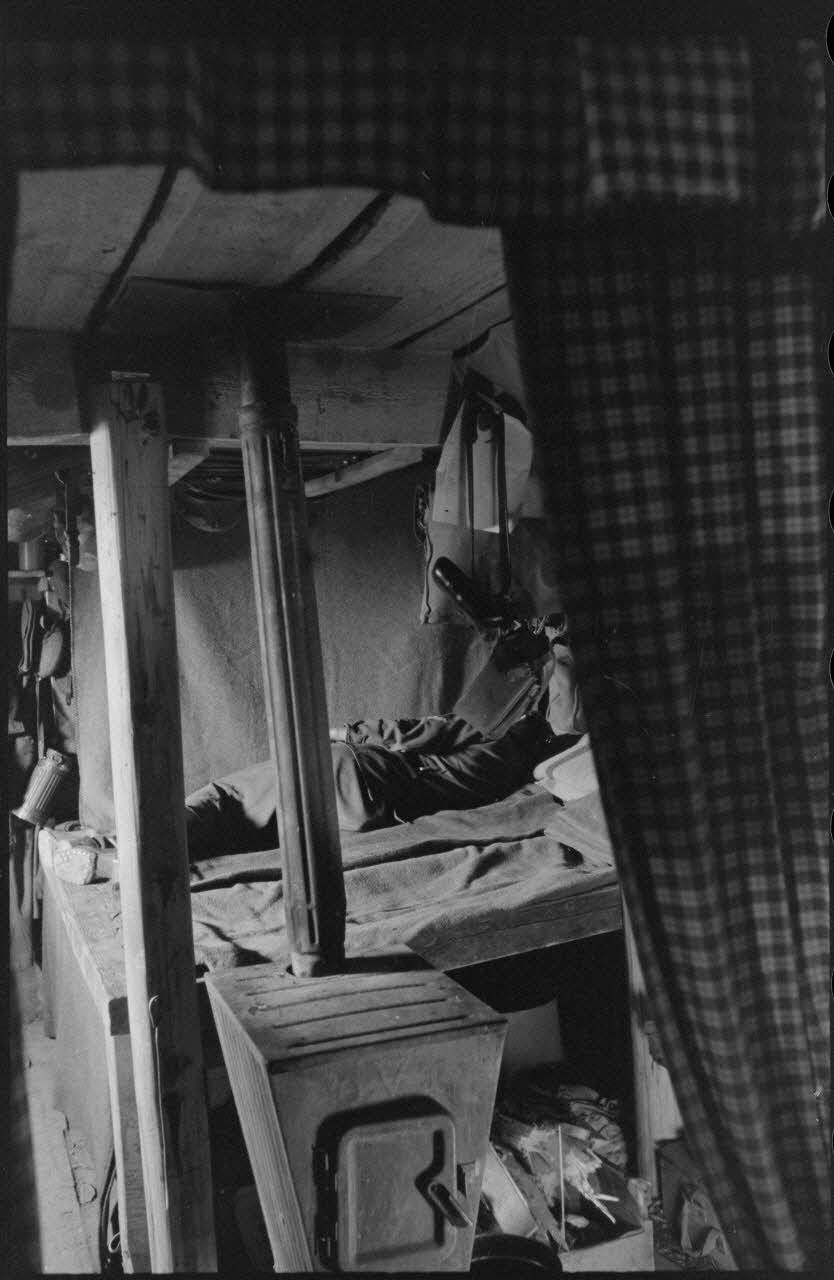 Un fantassin sculpte un bâton de marche (PK697 F772 L11 et L12). Des fantassins autour d'une table vont partager un verre d'une bouteille de Underberg (Semper idem) aux plantes aromatiques ( PK697 F772 L13 à L15). Aspects des lits réservés aux soldats, un poêle à bois les préserve du froid. Le sommier est rudimentaire et le plafond loge les fusils Mauser 98 k et les casques. Chaque recoin est utilisé pour ranger des objets, ici le plancher reçoit également des provisions aromatiques (PK697 F772 L23 à L24). Au mur, des étagères accueillent des livres et de la vaisselle. Plus loin, une pièce est réservée à un officier ( PK697 F772 L26 à L27). L'entrée de l'abri baptisé "Bunker der schweren Jungs" (abri des jeunes costauds) ( PK697 F772 L28). Un râtelier accueille l'équipement individuel des fantassins, composé de fusils Mauser 98k, de casques et de masques à gaz ( PK697 F772 L29). Au mur, une étagère accueille le courrier et de la lecture, ici le magazine "Die Woche" ( PK697 F772 L30). Un portrait d'Adolf Hitler et une horloge (coucou) se partagent le reste du mur ( PK697 F772 L31 et L32).