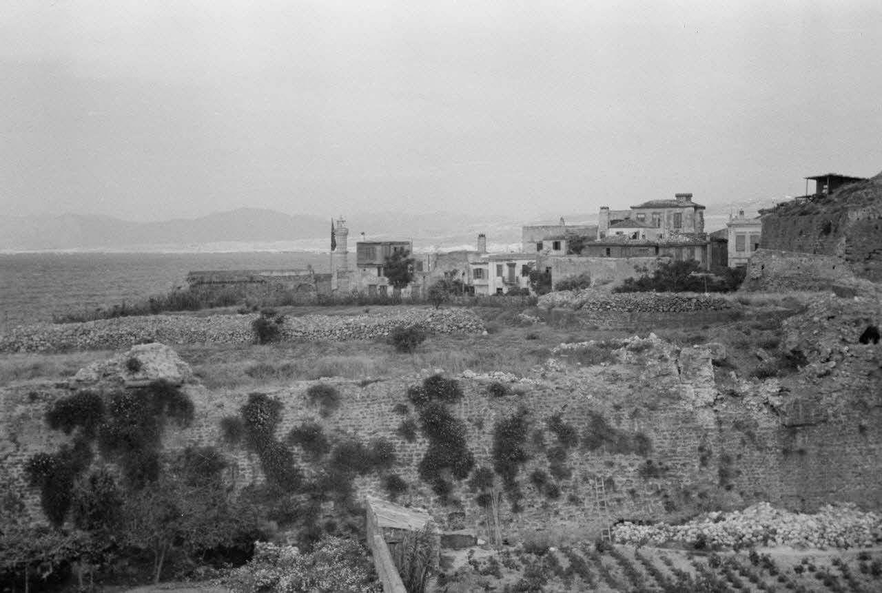 Paysage de la mer Egee (Ägäis). Le Soldaten Kino de la ville crétoise occupée, les actualités hebdomadaires y sont présentées. On remarque sur le mur du cinéma l'annonce du numéro 17 des actualiés hebdomadaires (Nr.17), qui pourait correspondre au "Die Deutsche Wochenschau 606/17/1942" daté du 15.04.1942. A proximité du cinéma, un coiffeur réservé aux forces d'occupation (Friseur Salon) et l'hôtel baptisé "Kreta" (DAA 1986 L14).