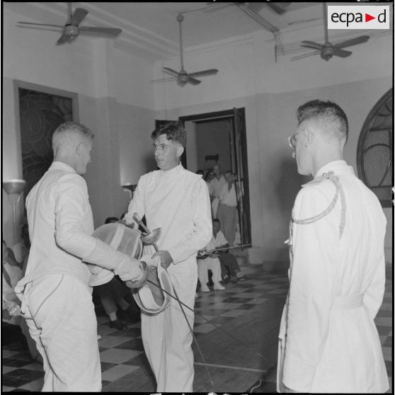 Un escrimeur devant les personnalités françaises et vietnamiennes venues assister au championnat militaire d'épée du Nord-Vietnam.