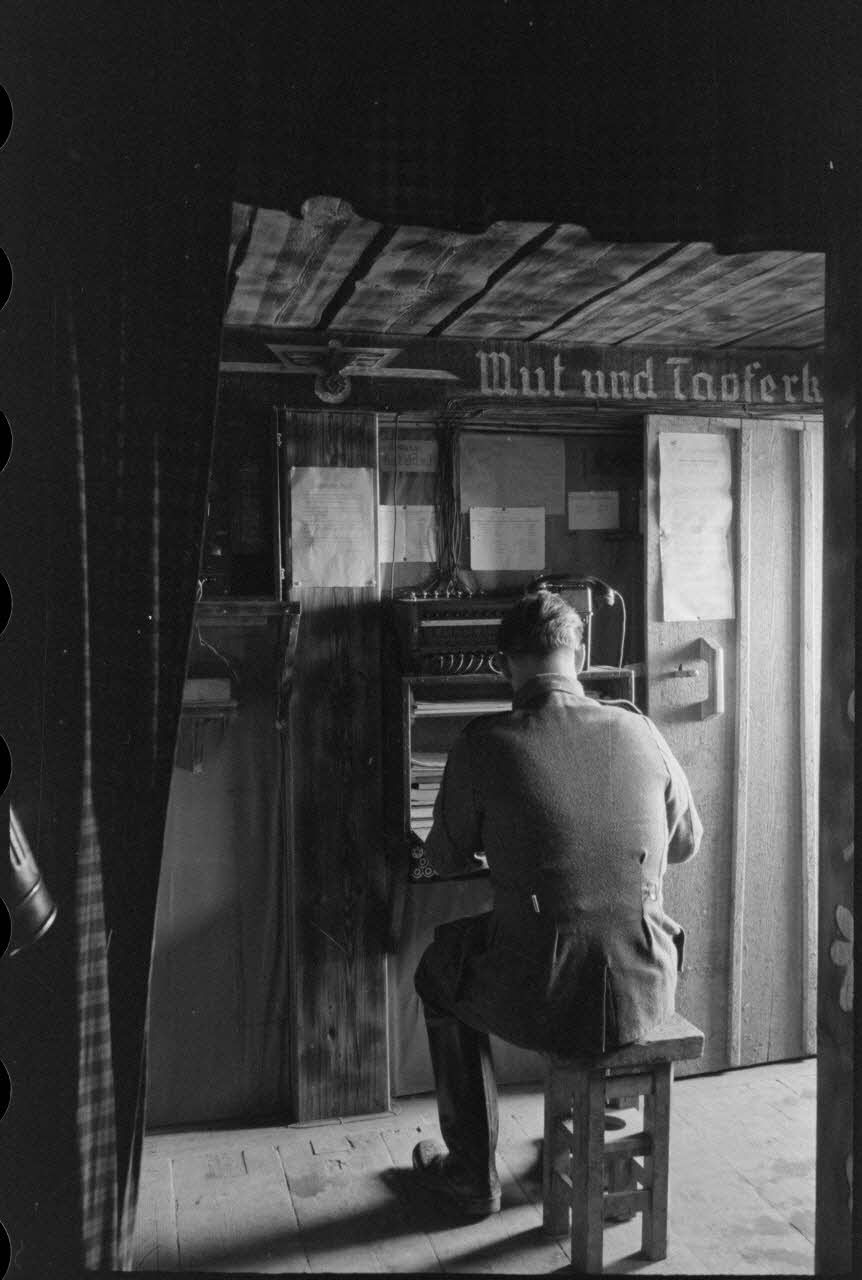 Assis dans un abri de la 205. Infanterie-Division, un transmetteur rédige du courrier, au-dessus de sa tête la devise "Mut und Tapferkeit" (courage et bravoure).