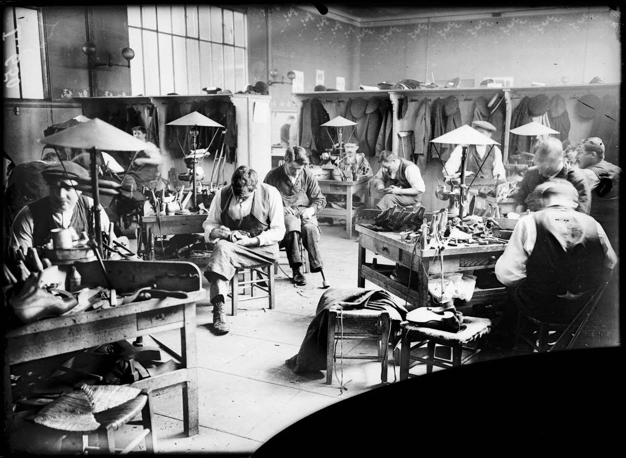 Atelier de rééducation des mutilés de guerre, 51 rue des Epinettes. Atelier des cordonniers.