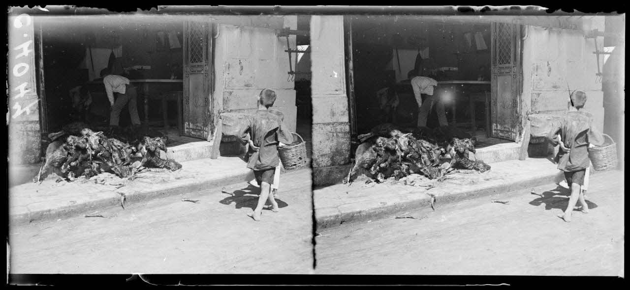 Athènes. Chez le boucher (à 14h on égorge les moutons dans la boutique). [légende d'origine]