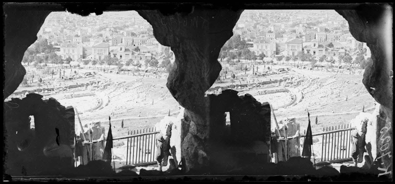 Athènes. La ville et le théâtre de Dionysos, vus de la Grotte de l'Acropole. [légende d'origine]
