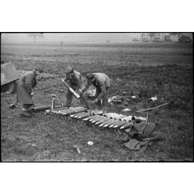 Artilleurs de la 32e batterie du XIe groupe du 64e RADB (régiment d'artillerie de division blindée) préparant des obus de 105 mm.