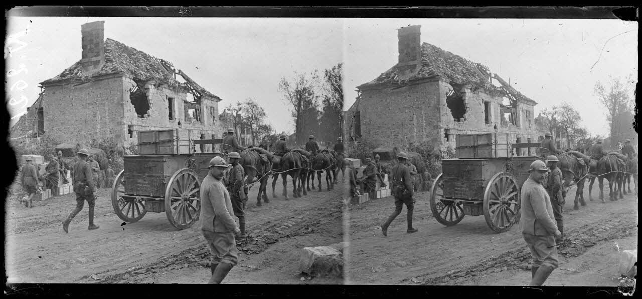 Voir film 14.18 A 71 (convoi d'artillerie sur la route de Soissons à Villers-Cotterêts, Malgaches creusant des trous individuels, 77 mm allemands capturés, char schneider revenant des lignes).